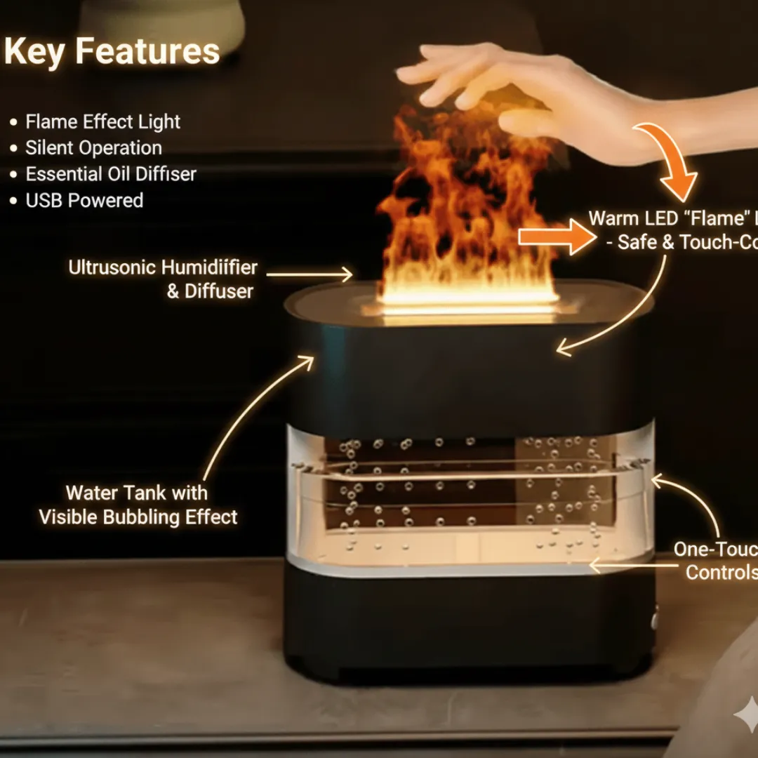 Transform your home into a sanctuary with our Essential Oil Aroma Diffuser. This unique device combines a powerful ultrasonic humidifier with a stunning, realistic flame light effect that is safe to touch. It effectively disperses a fine mist of your favorite fragrance to soothe the mind and hydrate the air. Featuring a transparent water tank and intelligent waterless auto-off protection, it ensures a safe and peaceful environment for sleeping, working, or yoga.