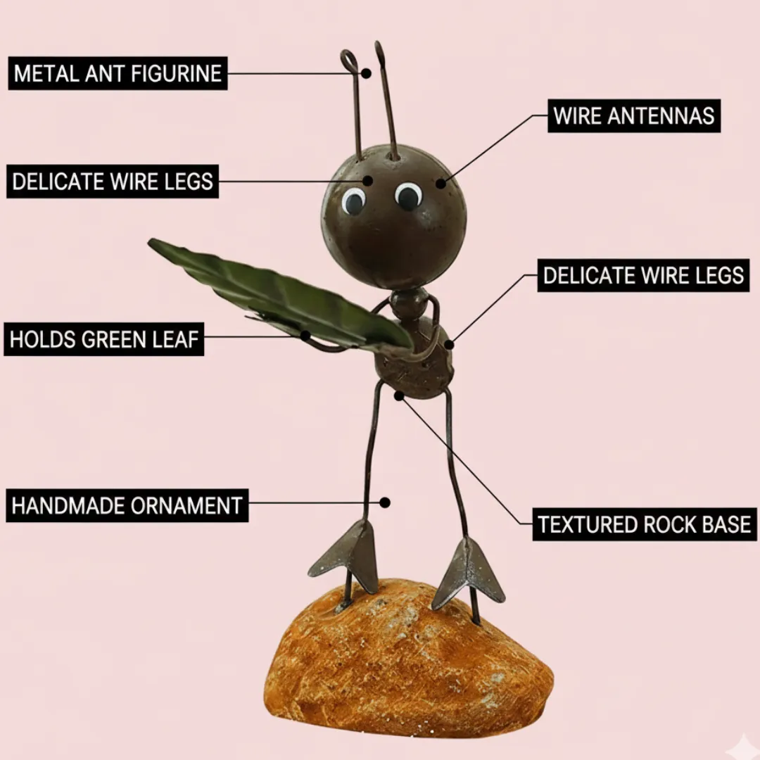 Add a touch of whimsical charm to your living space with this unique Ant Decoration Piece. Expertly handcrafted from durable metal, this figurine features a cute ant carrying a green leaf, standing atop a natural-looking stone base. Its rustic finish and playful design make it an ideal accent for bookshelves, office desks, or garden patios. This creative ornament blends industrial metalwork with nature-inspired art to create a conversation starter in any setting.